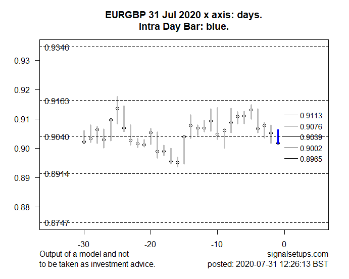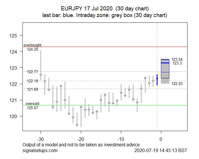 The model suggests that prices may break out of the “fair value” trading range and start to head up towards the 123.3 level. Alternate scenarios would be prices remaining in consolidation or breaking down below the lower end of the “fair value” zone at 121.69